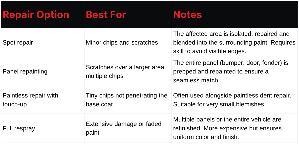 Cost: Prices vary by damage size, paint type (solid, metallic or pearl) and labor rates. Small repairs may cost a few hundred dollars, while full panel refinishing can run into the thousands. Always request a written estimate.