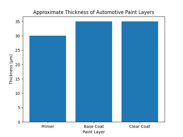 It helps to see what goes into a factory finish. The bar chart below illustrates a typical distribution of paint layers by thickness. While actual values vary by manufacturer, the entire paint system typically measures about 4–6 mils (roughly 100–150 µm) thick.